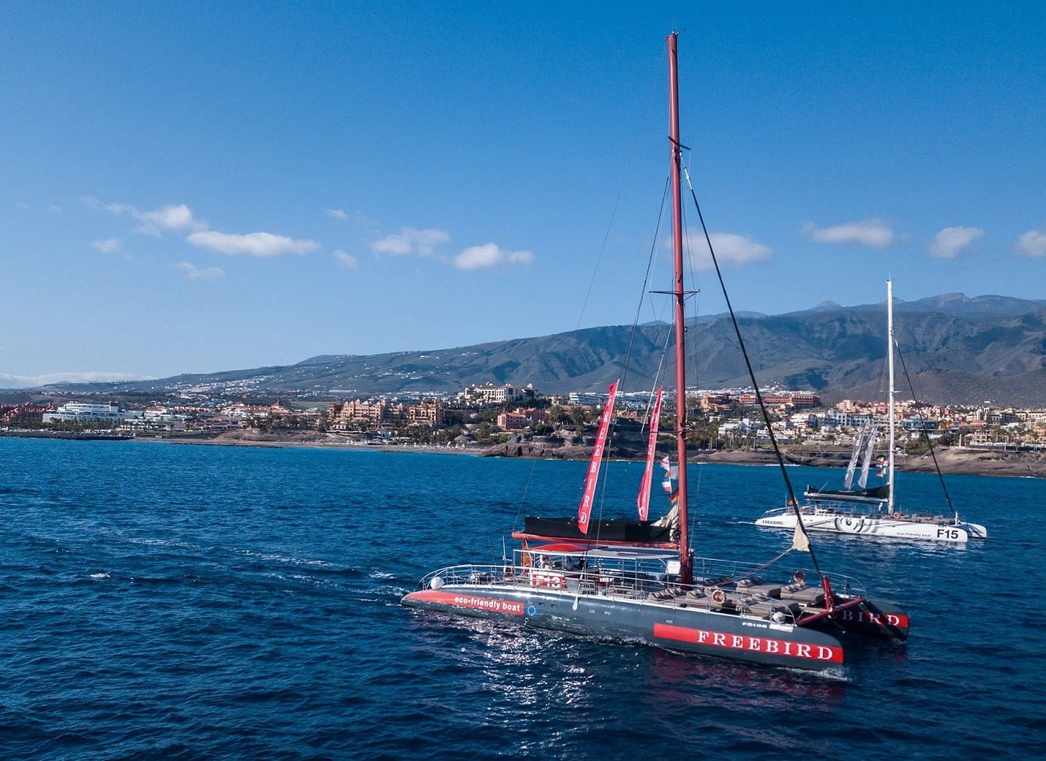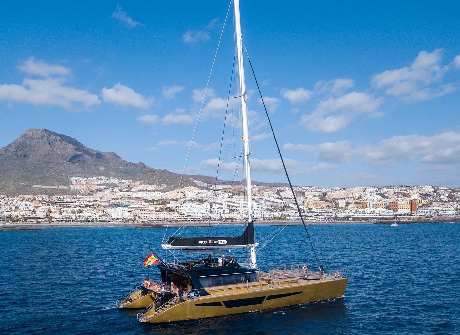 Freebird Catamaran offers exclusive 3h or 4.5h all-inclusive whale-watching tours with swim breaks in South Tenerife, Masca & Los Gigantes.
