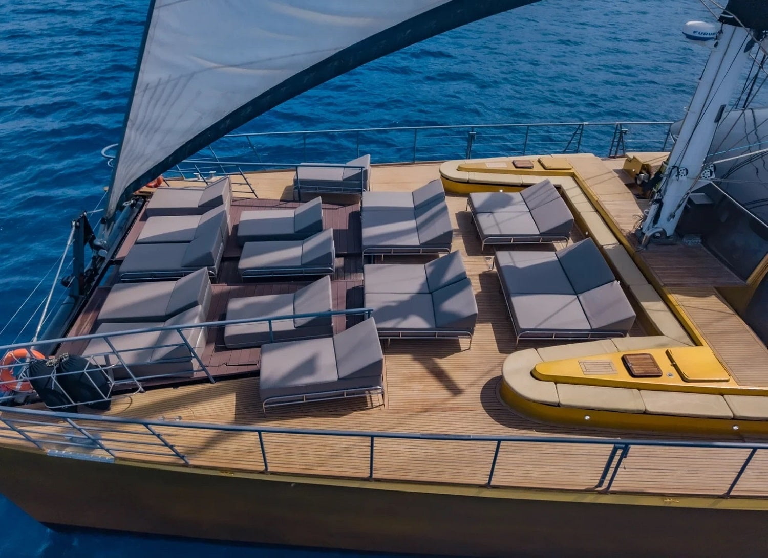 Catamarans have an open bar, seating areas, sunbeds, bathrooms. They are also equipped with showers with fresh water. There is a platform at the back to make getting in and out of the sea super easy.