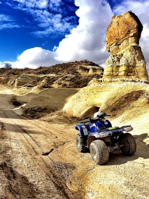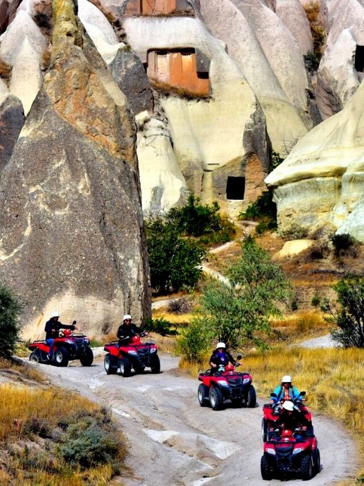 The Cappadocia terrain looks something like a lunar landscape.  Spectacular to view by early morning, daylight and twilight.  Fortunately the Quad bikes take a tour of this unique area, for your delight.  Anyone familiar with the quads (or ATVs as they are sometimes known) will understand the adrenalin rush of travelling along dusty, muddy roads into the unknown.  This tour is somewhat different, although the adrenalin rush is sill there.  Cappadocia is famed for its fairy tale chimneys and ancient underground cities, for its mysterious rock formations and ancient christian monasteries.  Riding your quad through this landscape is truly enchanting.